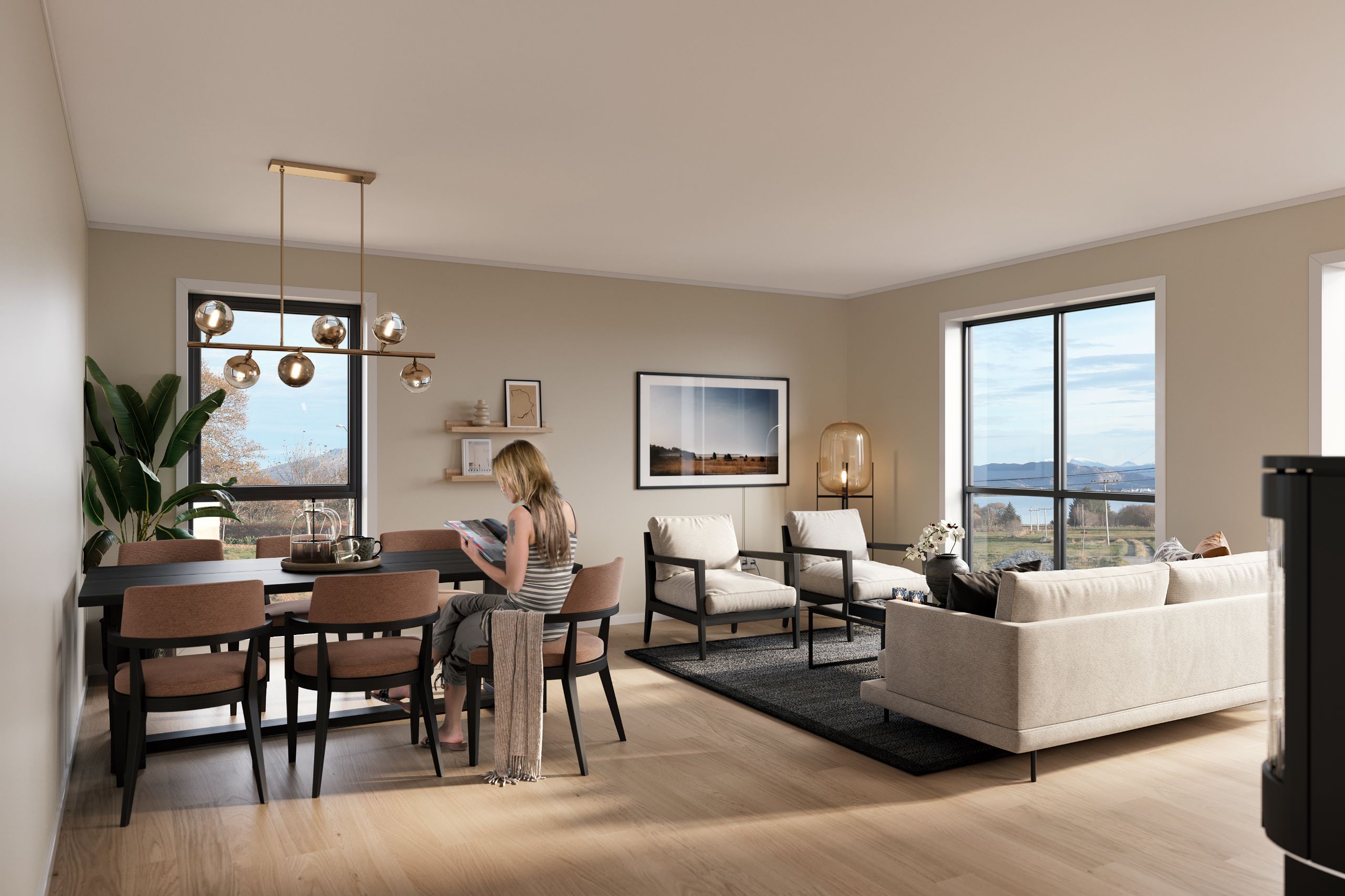 Bustaden har gjennomgåande god standard. Inneheld m.a. Gerflor Virtuo Rigid 55 klikk vinyl i alle opholdsrom. Innvendige vegger blir levert med ferdigmala plater i standard fargar.